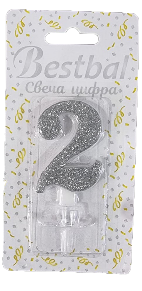 Свеча цифра "2" глиттер серебро Silver